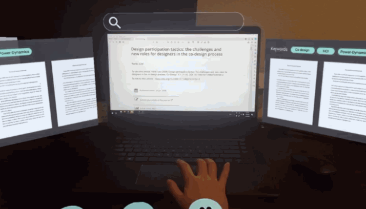 Using AR, the assistant provides more workspace for the researchers. The users can use horizontal, vertical, and physical space to organize their work and collaborate with the team. They do not need to switch back and forth from browsers. The dispersion of the windows is also ergonomically designed.